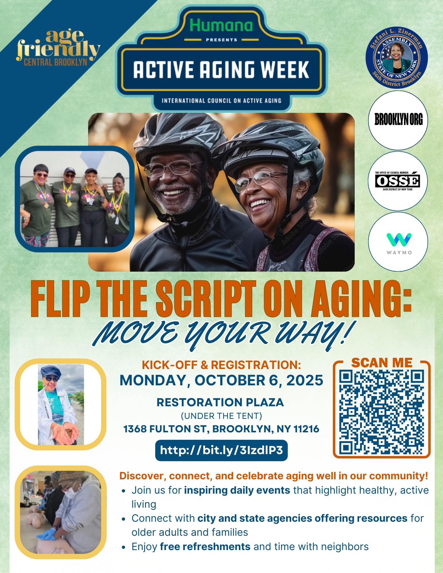 ACTIVE AGING WEEK is the signature fall event for Age Friendly Central Brooklyn, Inc. and launches our annual renewal/membership drive and signals the start of our program lineup for 2025-2026. Funding for this year’s ACTIVE AGING WEEK is provided by Assembly member Stefani L. Zinerman, Brooklyn.Org, Council Member Chi Ossé, and Waymo.